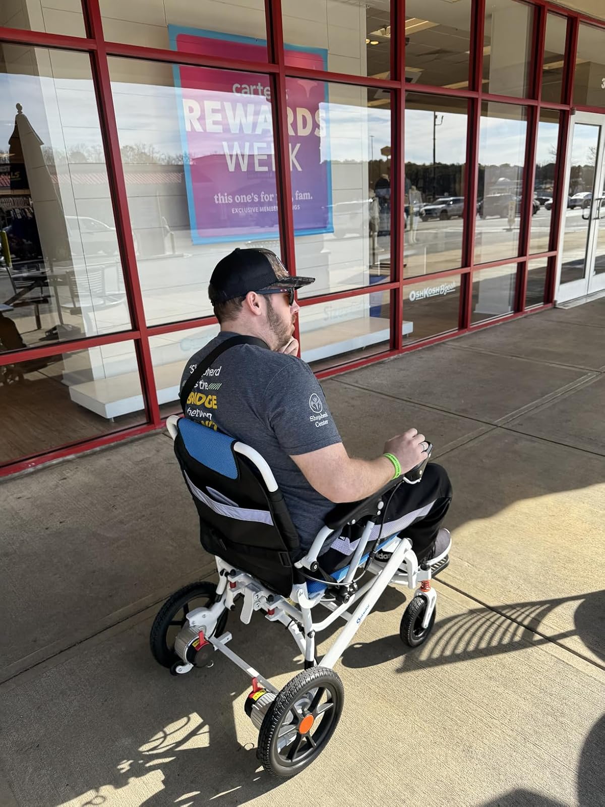 My son is 32 years old, 200 lbs with a spinal cord injury. He has a manual wheelchair, but we wanted to get him a foldable electric one for trips, etc. We received this one and it required very little assembly. It is lightweight and he used it all day yesterday at an Outlet Mall. We are very pleased. Would recommend.