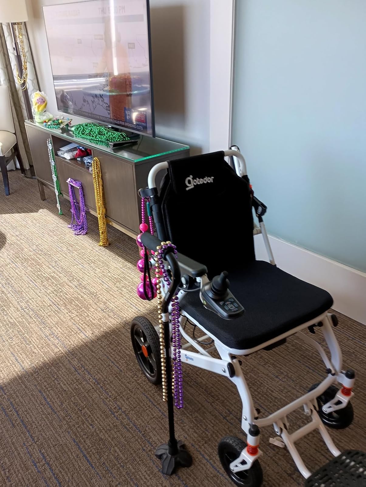 Chair works great and easy to maneuver. No issues taking on airplane. We gate checked it with no issues Many people wanted to know where to get one. Battery lasted as stated. No issues. Picture of me in chair on streets of New Orleans during Mardi Gras. Taking it to Key West next. Also,great customer service.